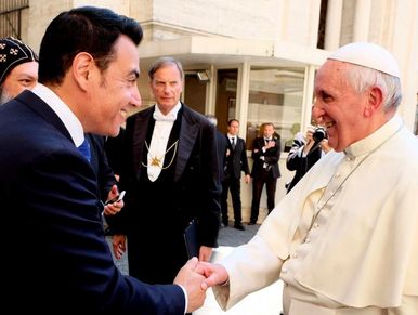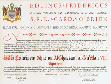 Investiture of HRH Prince Gharios El Chemor of Ghassan Al-Nu'Man VIII as a Papal Knight in the Equestrian Order of the Holy Sepulcher of Jerusalem on November 29th 2014 at the Cathedral in Amman, Hashemite Kingdom of Jordan. Ceremony presided by His Beatitude The Latin Patriarch of Jerusalem Msgr. Fouad Twal, the Grand Prior of the Order of the Holy Sepulcher.